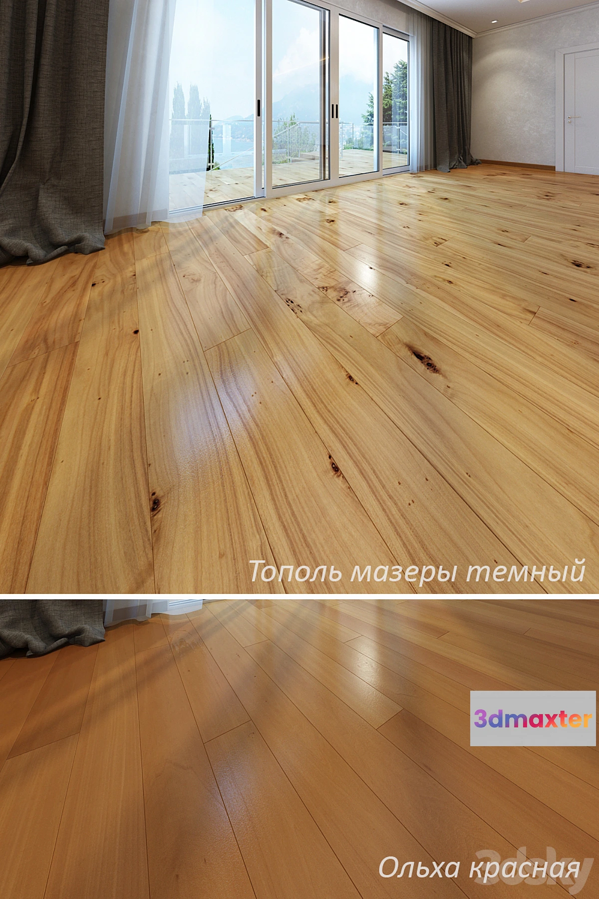 Below there are a collection of materials of wood (poplar and alder masers dark red) which uses high resolution textures – more than 3500 pixels. longer side. Materials created by MultiTexture + FloorGenerator include maps Diffuse Reflect Bump. In the archive except textures also available .max2012 file with the finished floor of 5×5 meters and materials to it .mat die size 2200x180mm even more high-quality materials you can find in my profile http://3dsky.org/users/lilyok/models