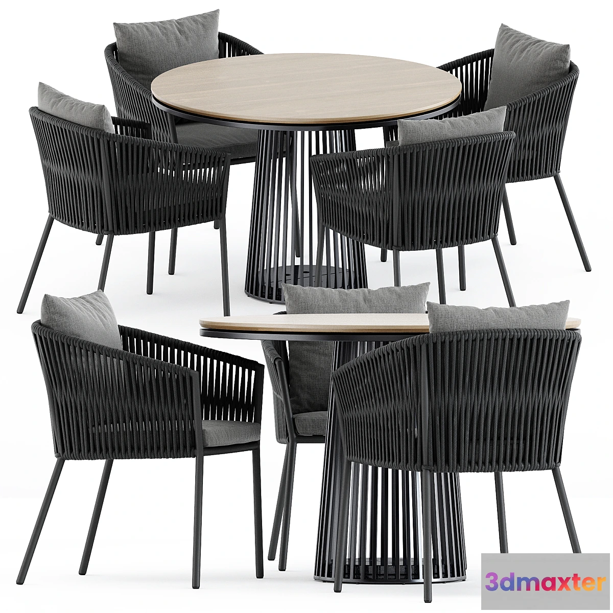 Porto Dining Chair by burkedecor and Grid table by solpurinnPorto dining chair by burkedecornCollection: Solanonhttps://www.burkedecor.com/products/porto-outdoor-dining-chair-by-bd-studio nDimensions: W: 61 cm x D: 57 cm x H: 75 cmnnGrid table by solpurinDesign: Karsten WeigelnCollection: Gridnhttps://solpuri.com/produkt/grid-dining-tisch/ nDimensions: D: 110 cm x H: 75 cm