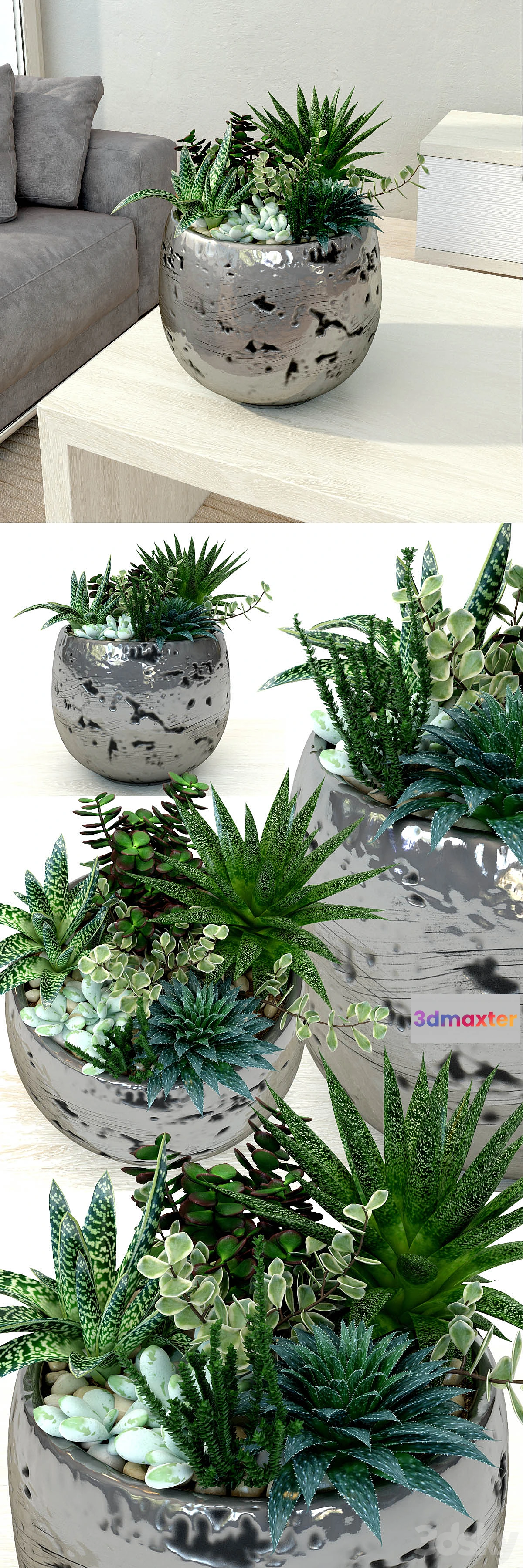 Composition of succulents plants in ceramic pots modern exclusive design. Planters will be a great addition to home office or street spaces. 3d model plant high detail – ideal for close-up! A thorough scan optimized grid. Dimensions: 550h550h430h landfills: 560000 More high quality models: http://3dsky.org/users/quetzlcoatl/models Website + various options for performances and photo in the interior: http://olinhome.com/ru_RU/галерея