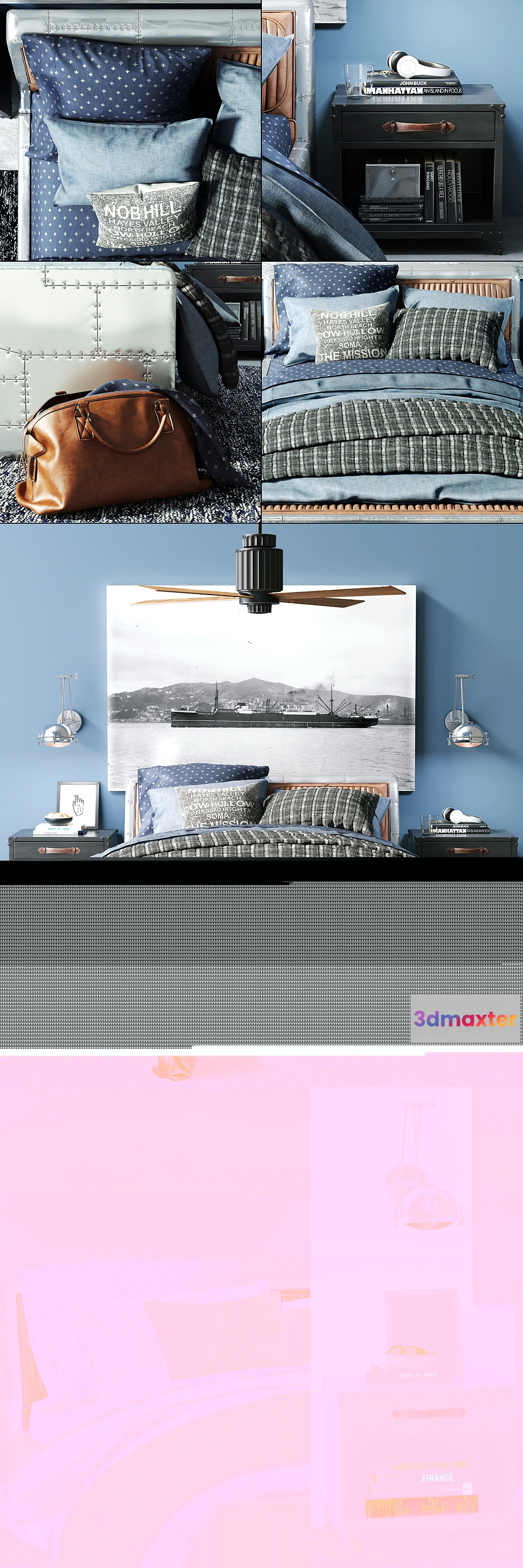 Set items in the room or teenage boy from Restoration Hardware. The file contains the following items: – Bed AVIATOR STORAGE BED – Linen WASHED CHAMBRAY & PLUS SIGN BEDDING COLLECTION – Bedside tables CALVIN LOW NIGHTSTAND – Carpet MELO RUG – Bra INDUSTRIAL HEADLIGHT SCONCE (hierarchy set) – Lyustra- fan EARHART CEILING FAN VINTAGE BLACK – Headphones a glass of water books bag. Turbosmooth (not folded stack). Scan Unwrap UVW configured. The archive contains a file with the materials. Textures and mat