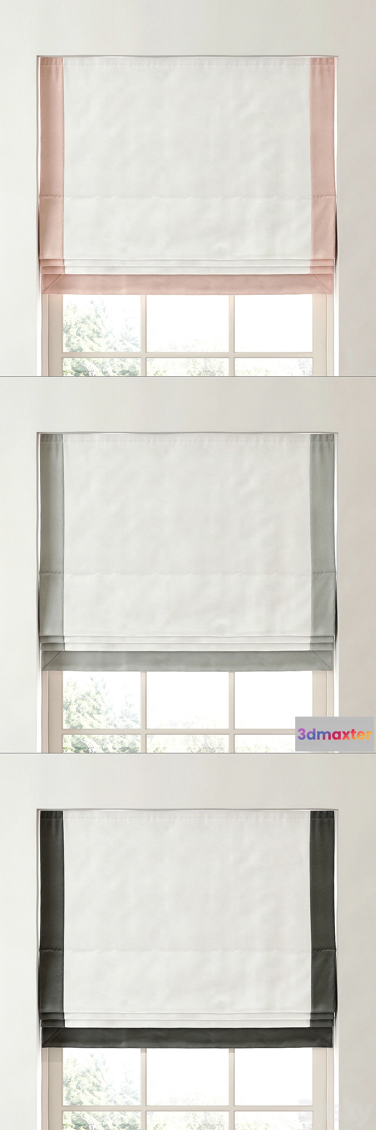 Roman blinds in three colors BORDERED COTTON CANVAS CORDLESS ROMAN SHADE from Restoration Hardware. Turbosmooth (not folded stack). Scan Unwrap UVW configured. The archive contains a file with the materials. Textures and materials have an individual name in English. My Other models http://3dsky.org/users/scion/models quick render!