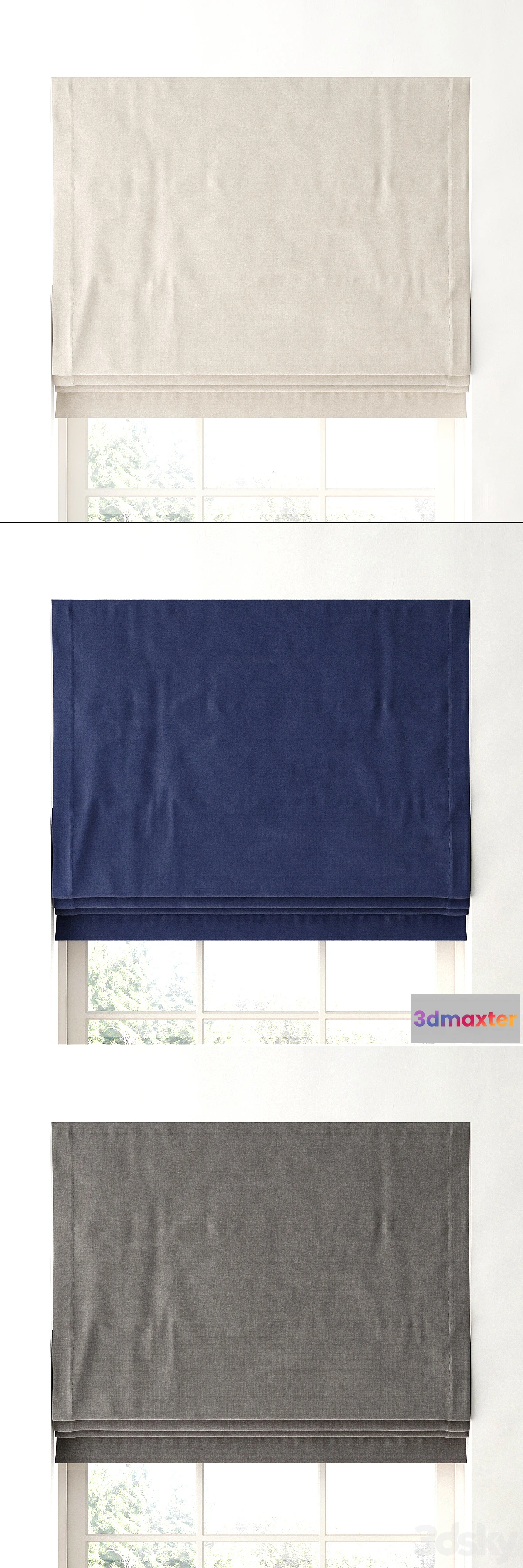 Roman blinds in three colors COTTON CANVAS CORDLESS ROMAN SHADE from Restoration Hardware. Turbosmooth (not folded stack). Scan Unwrap UVW configured. The archive contains a file with the materials. Textures and materials have an individual name in English. My Other models http://3dsky.org/users/scion/models quick render!
