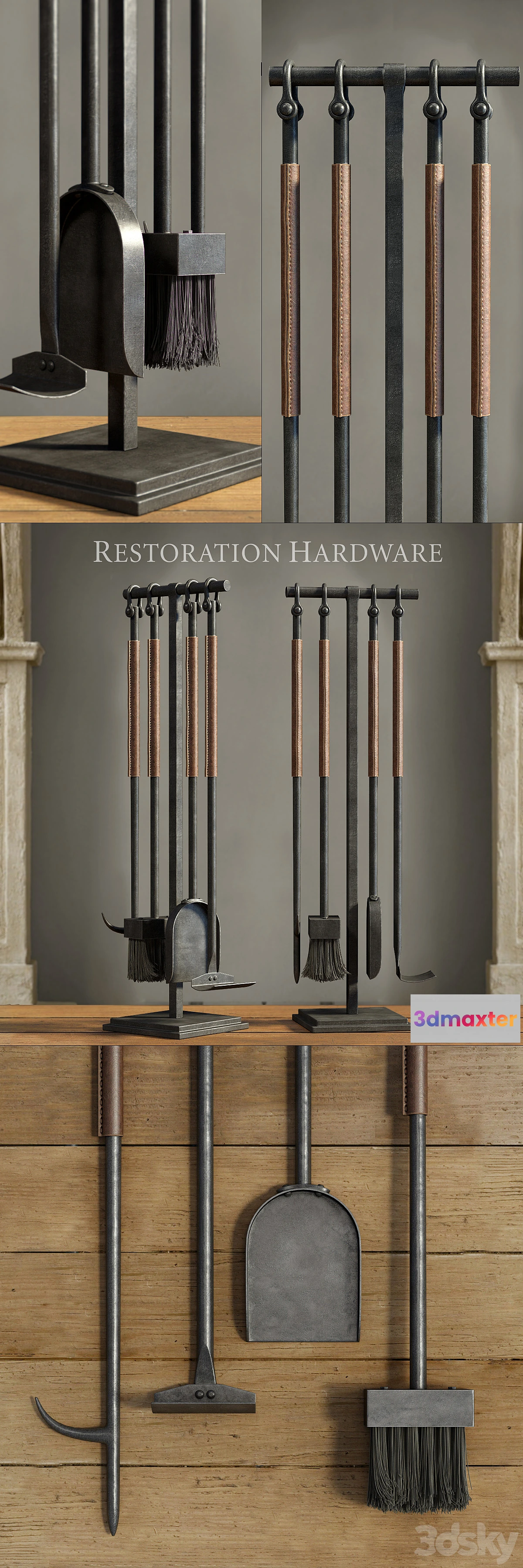 Fireplace accessories LEATHER RIVET HEARTH TOOL SET from Restoration Hardware. In the scene there are only 4 ehugolniki. Models are made by smoothing Turbosmooth (not folded stack) .All textures and materials have an individual name in English. Enjoy render!