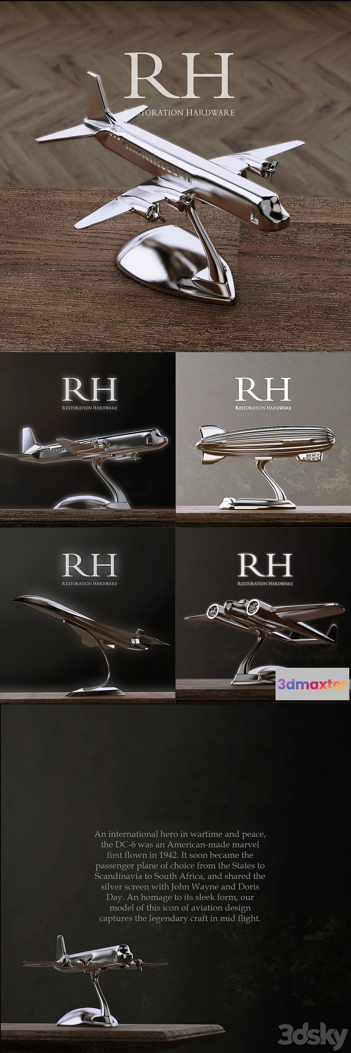 Decorative set of four models of the legendary aircraft from the RH. 1) DC-6 PLANE MODEL 2) ZEPPELIN MODEL 3) DUTCH FOKKER GI PLANE MODEL 4) CONCORDE JET MODEL descriptions from the manufacturer: DC-6 PLANE MODEL $ 449 Special $ 399 An international hero in wartime and peace the DC-6 was an American-made marvel first flown in 1942. It soon became the passenger plane of choice from the States to Scandinavia to South Africa and shared the silver screen with John Wayne and Doris Day. An homage to its sleek f