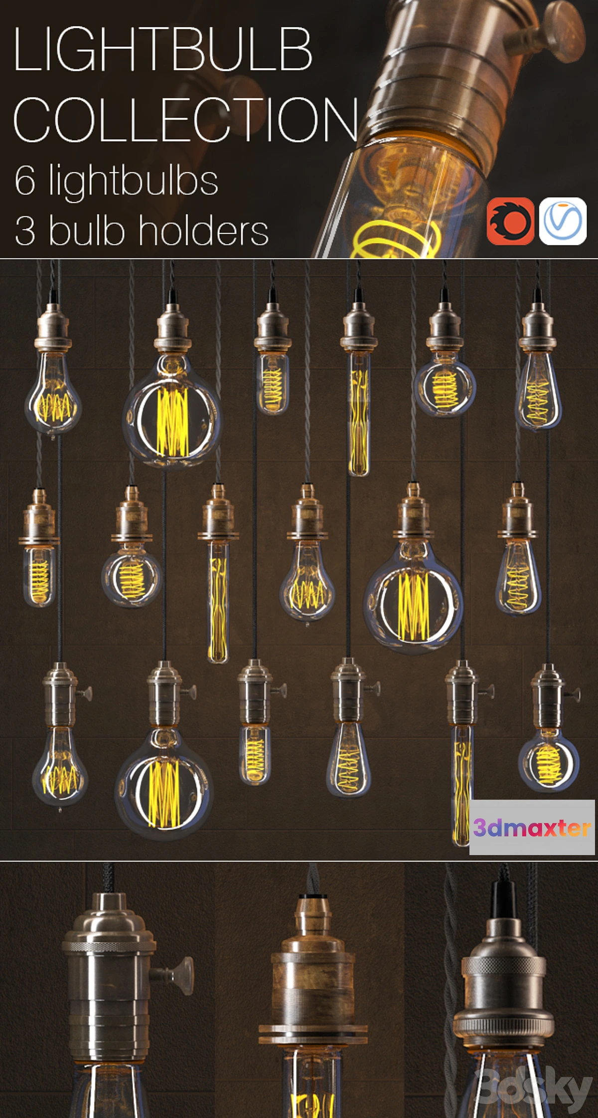 6 “Edison” lightbulbs 3 lightbulb holders CORONA and VRAY files