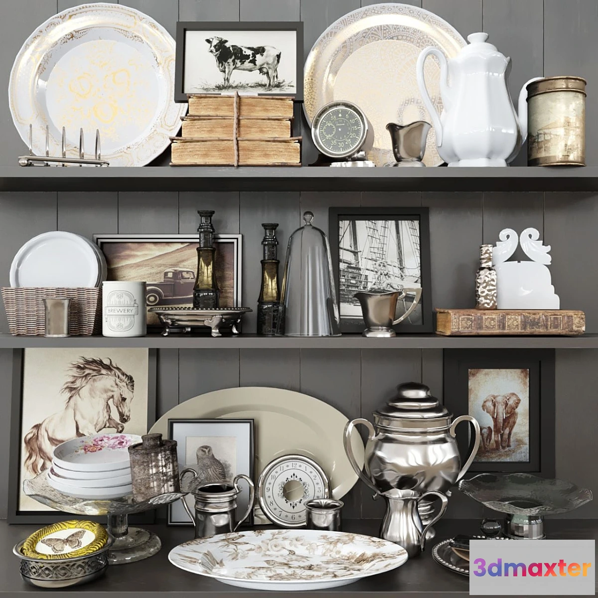 3D Models / Kitchen / Other Kitchen Accessories / Shelf with antique decor books and crockery