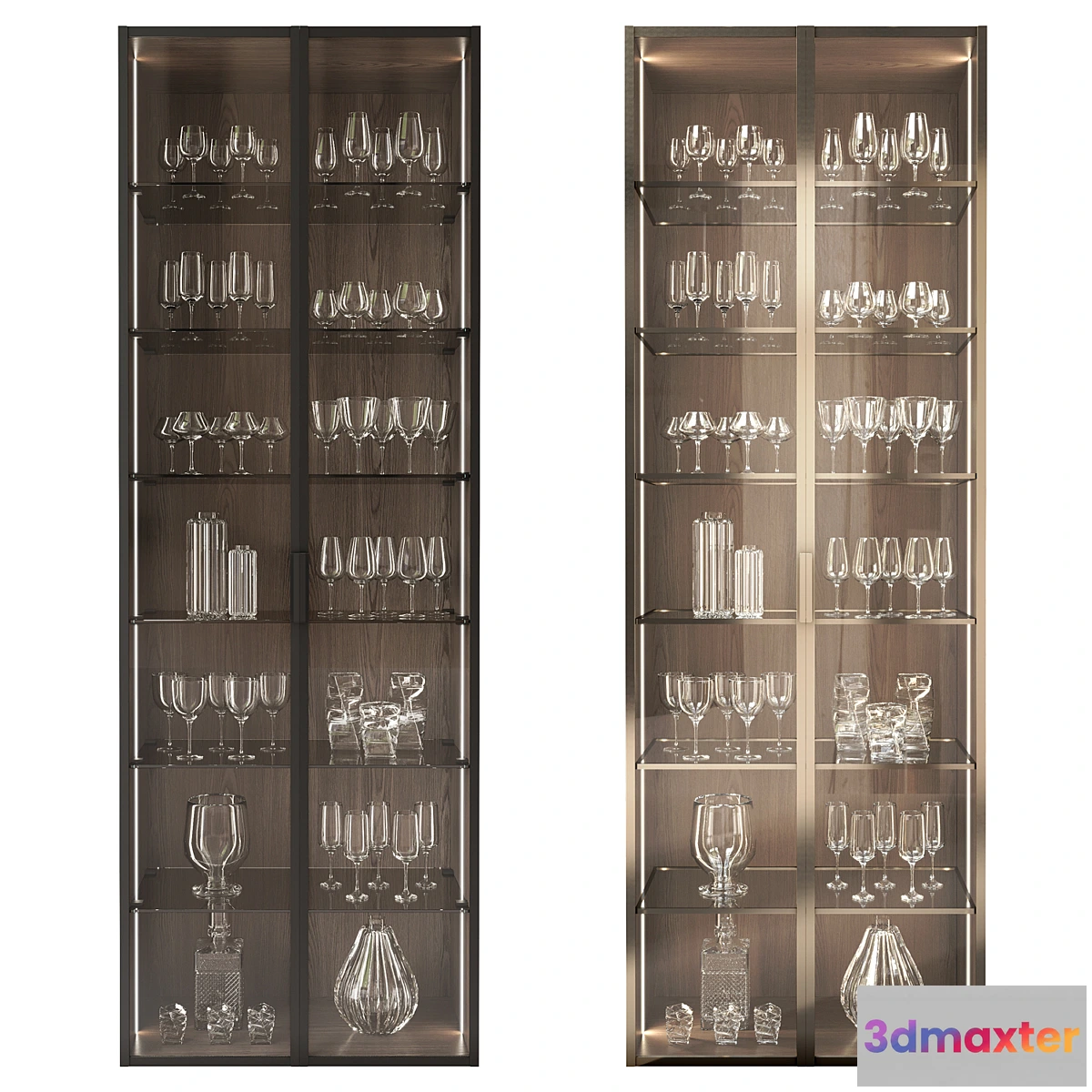 The export file is saved without Turbosmooth the grid will be like in the preview with the grid. To make the result look like on the main preview put the Turbosmooth modifier with 1 iteration on the entire decor except for objects vase_1(2 vases in the middle) and vase_10 and glass _10 (decor on the bottom shelf)