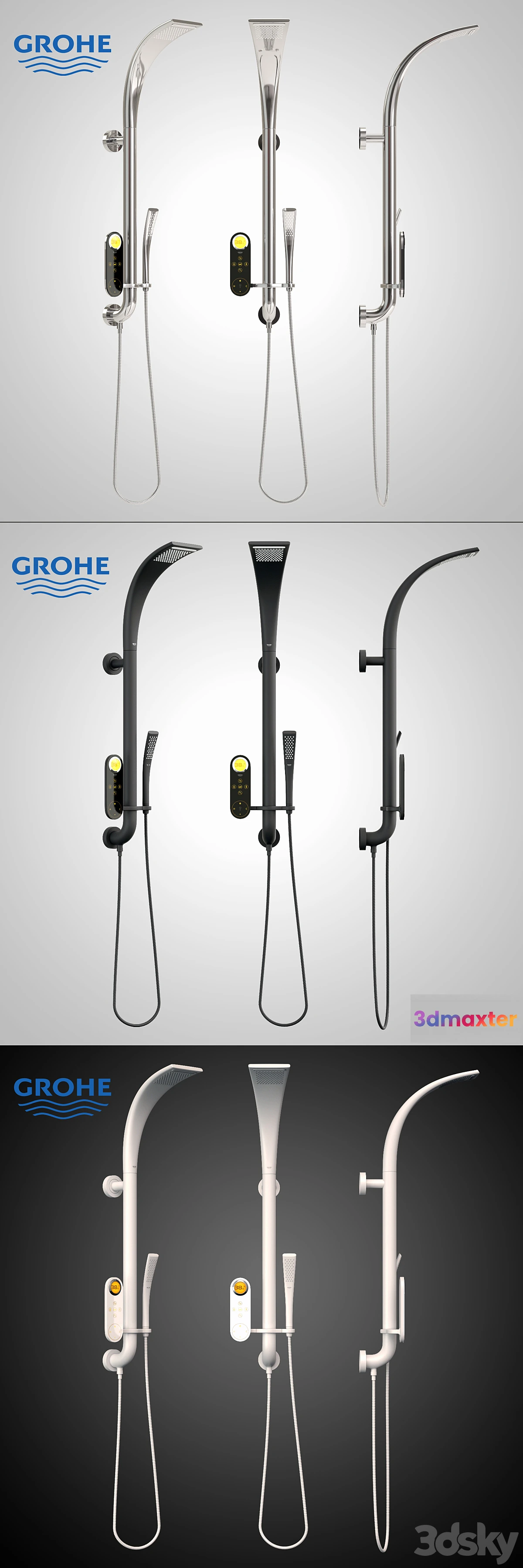 Shower system GROHE ONDUS AQUAFOUNTAIN in three materials: white moon chrome black velvet. Enjoy render!