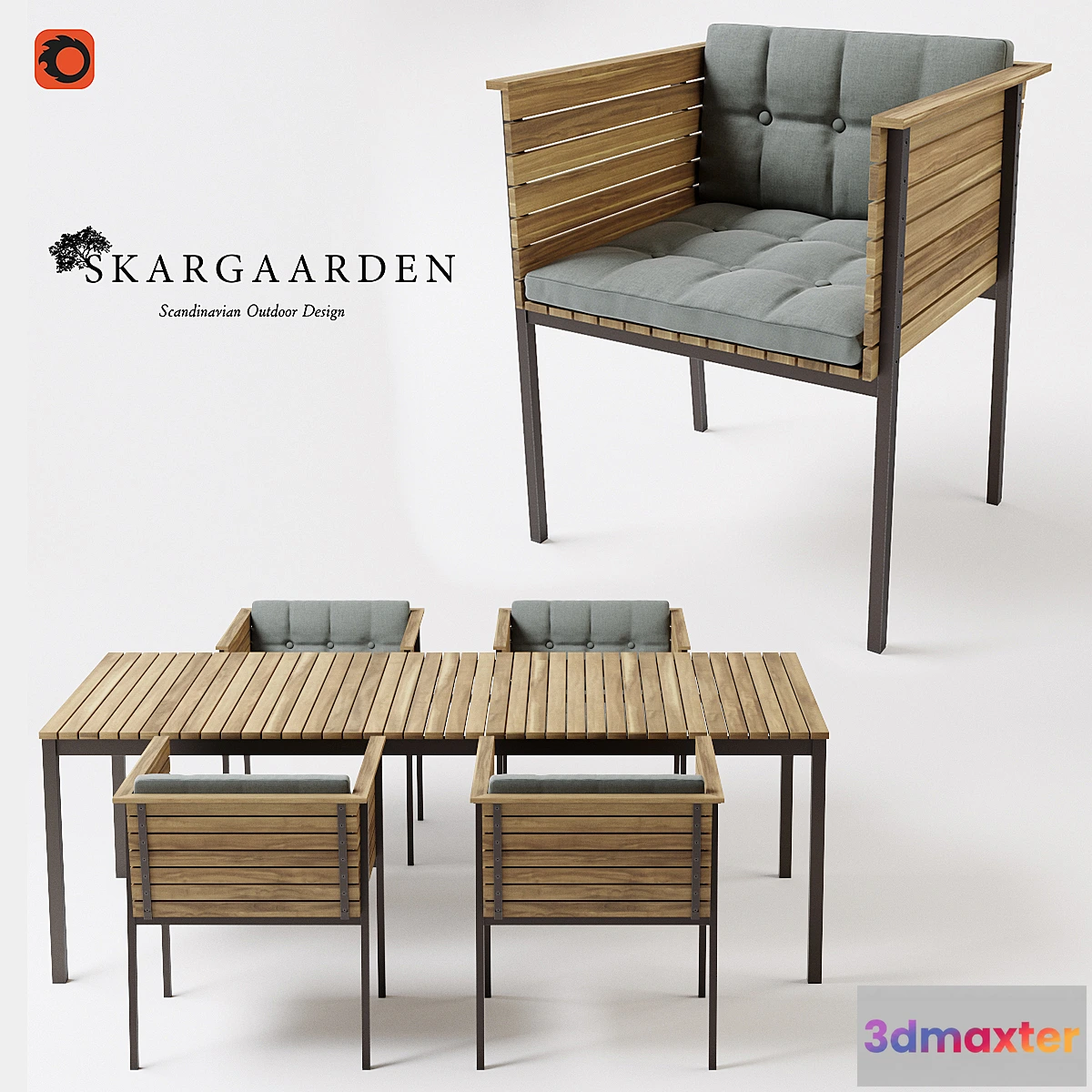 HARINGE ARMCHAIR Black stainless steel frame with teak slats & Natural Sunbrella linen W: 62.5 cm D: 57 cm H: 72 cm Skargaarden Haringe armchair table wood outdoor exterior