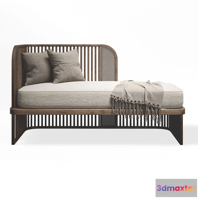 The Indochine Sofa 3D Model is a three-dimensional representation of a contemporary daybed, featuring a sleek wooden framework and plush, beige upholstery. This sophisticated piece combines minimalist aesthetics with functional comfort, showcasing an integrated headboard and thoughtfully placed accent pillows. The model captures the refined elegance of modern furniture design.
