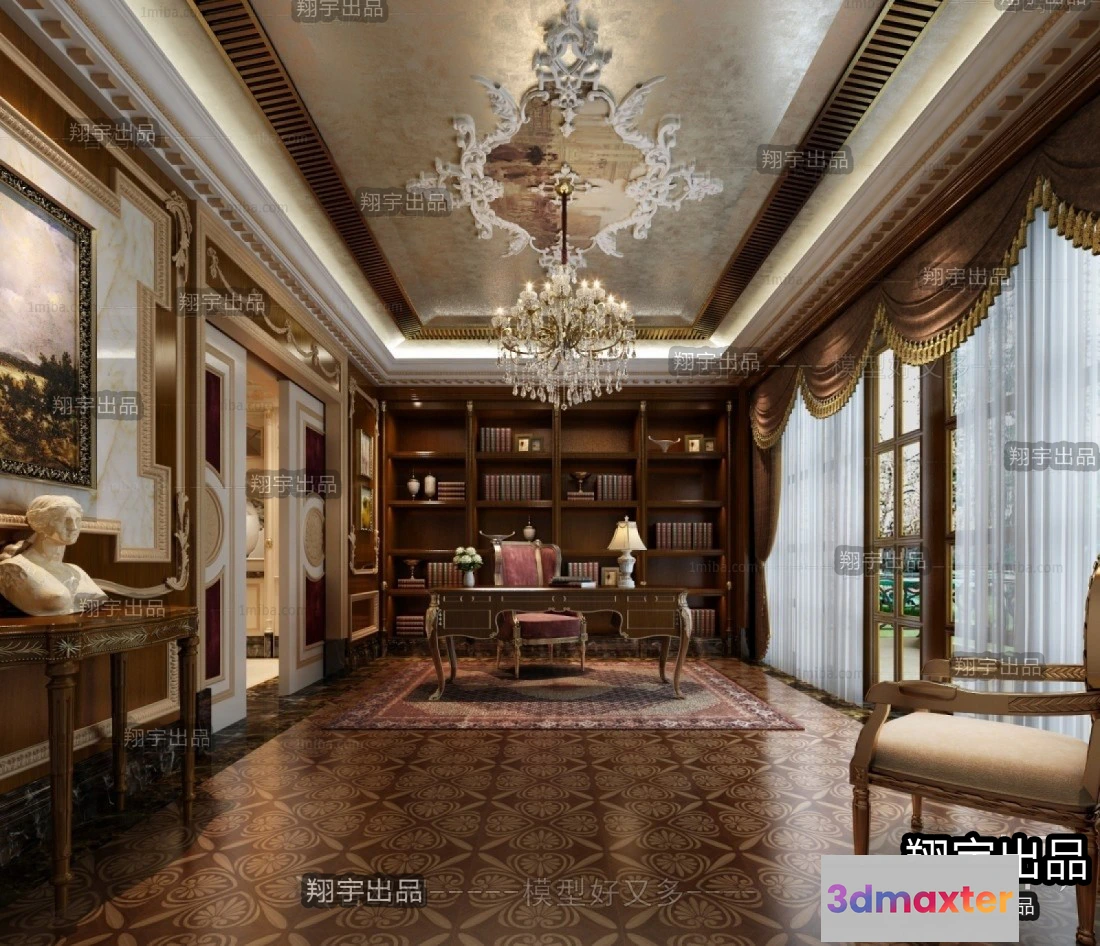 3D Models / 3D Scenes / Interior / Office Home / Study 3D Interior Scene Model – European Style – 013 3D Max