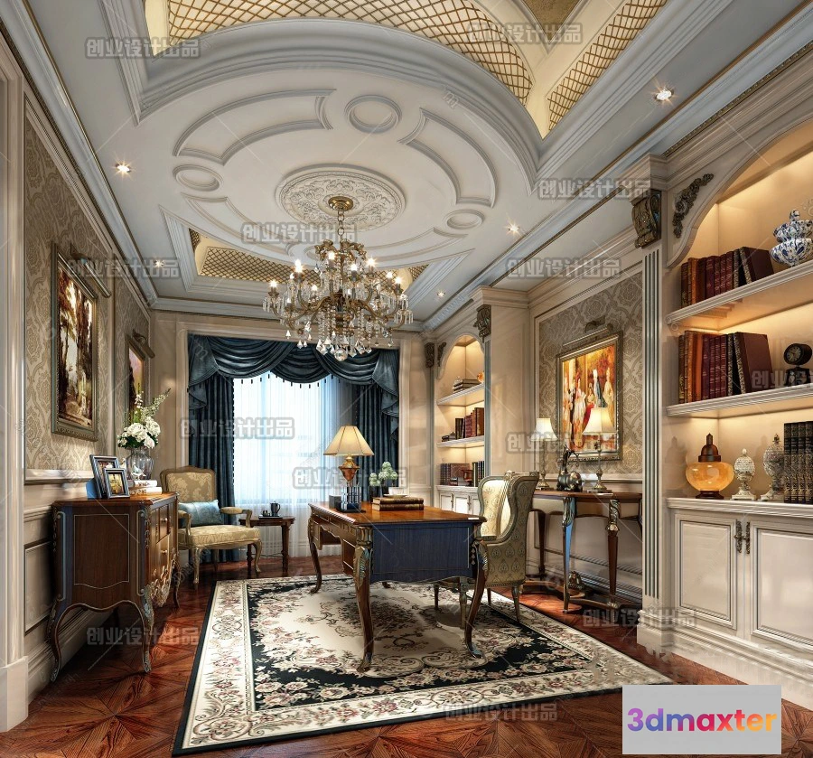 3D Models / 3D Scenes / Interior / Office Home / Study 3D Interior Scene Model – European Style – 017 3D Max