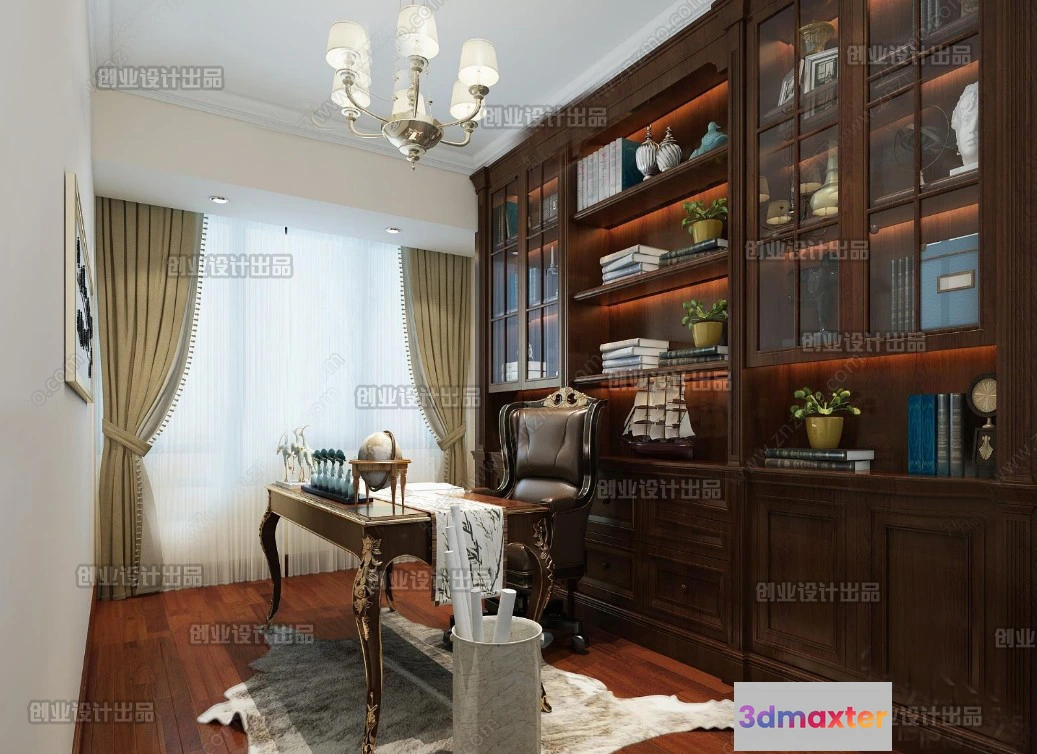 3D Models / 3D Scenes / Interior / Office Home / Study 3D Interior Scene Model – European Style – 018 3D Max