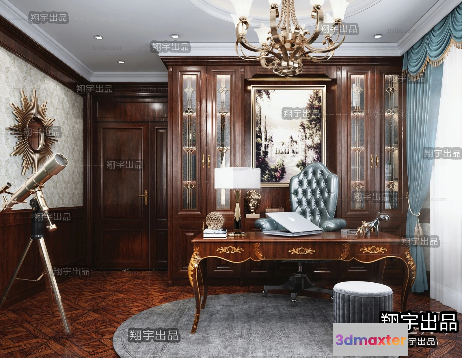 3D Models / 3D Scenes / Interior / Office Home / Study Space 3D Interior Scene – American Style – 004 3D Max