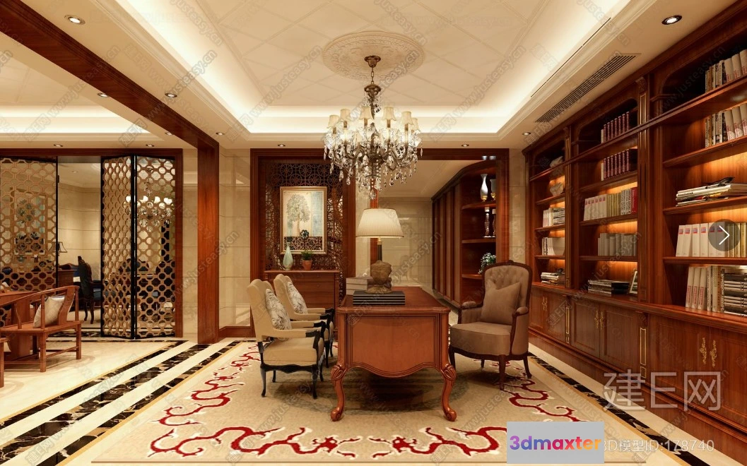 3D Models / 3D Scenes / Interior / Office Home / Study Space 3D Interior Scene – American Style – 006 3D Max