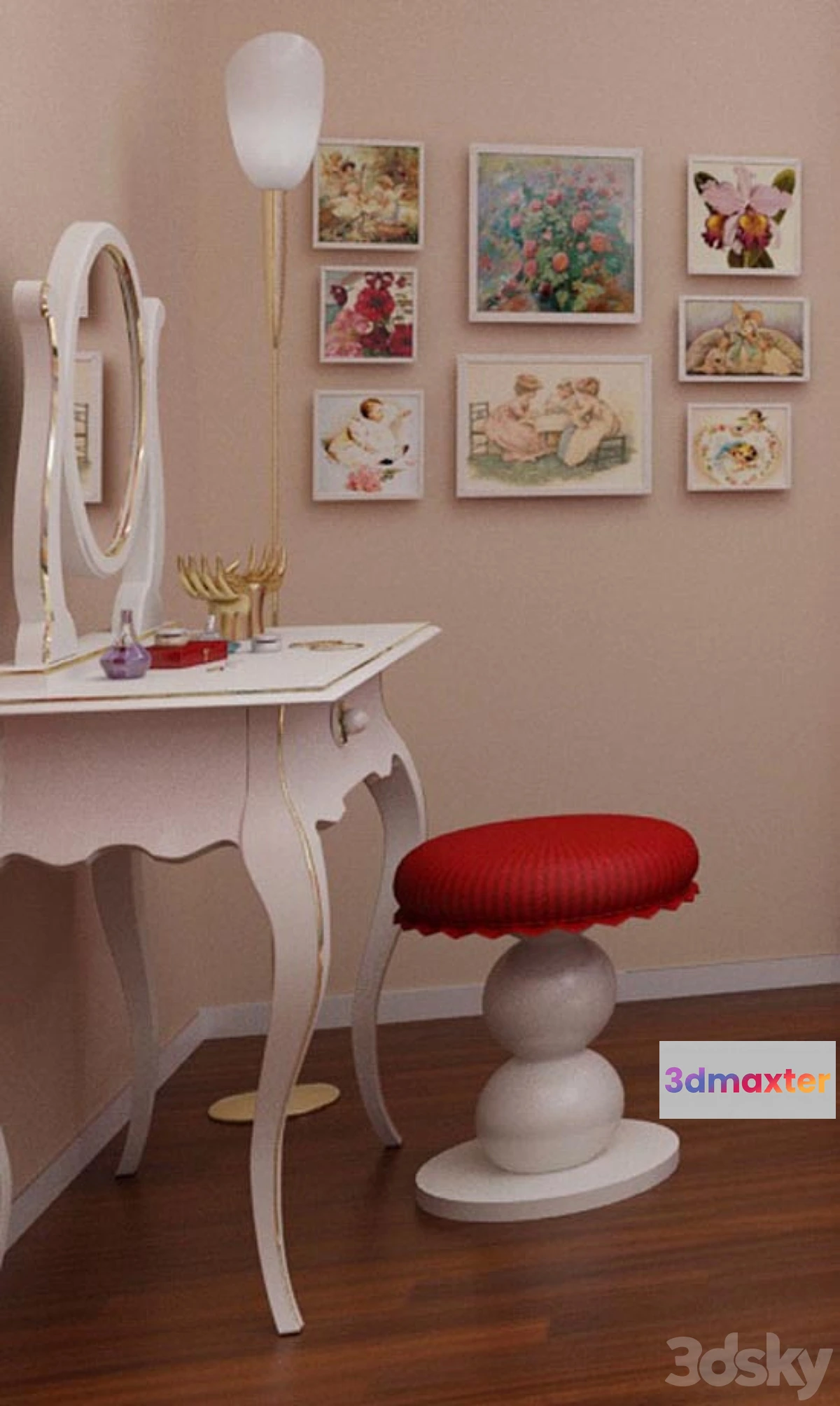 Vanity ART 0/0/5 pufART 27 and round table ART 0/6 Serafino Marelli (Italy) Festival & Oro collection can be used for children’s rooms in a classic style. Materials are configured. The dimensions of the toilet table h150 * 86 * 45 * 40 * pouf h50 40 table h52 * 52 * 52