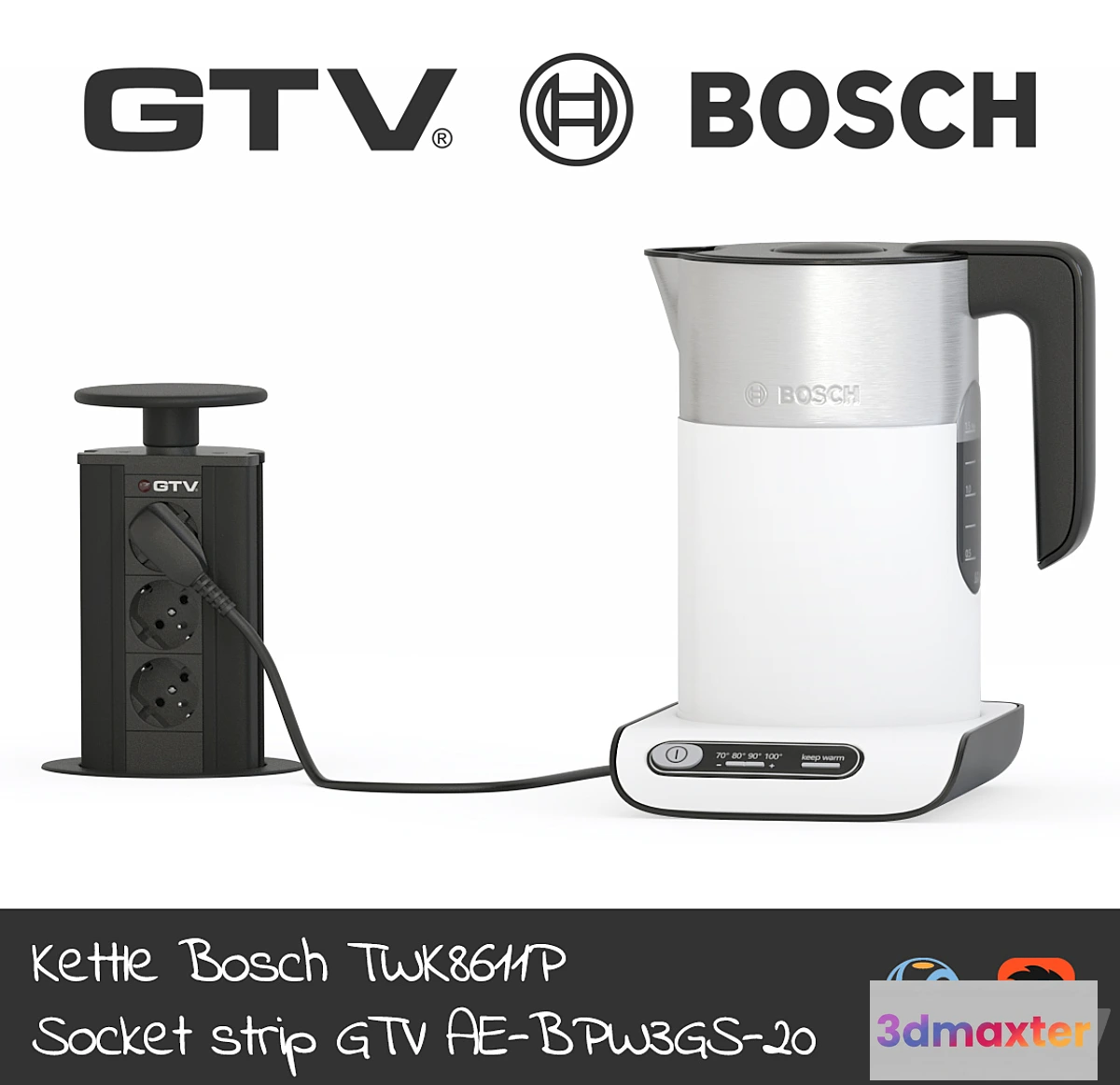 Teapot Bosch TWK8611P: -Width-220mm-Depth-250mm-Height-330mm Temperature Control TemperatureControl: choice of water heating temperature 70 ° C 80 ° C 90 ° C and boiling point. KeepWarm Function: Keeps the set temperature for 30 minutes. 3 degrees of safety: automatic shut-off when boiling water protection against overheating in the absence of water the function of disconnection when removed from the stand. Easy to operate: the lid is opened by pressing a button. The capacity is 1.5 liters. GTV Outlet Box AE-BPW3GS-20: -Width-112mm-Depth-130mm-Height-270mm. Retractable GTV AE-BPW3GS-20 outlets for the countertop are installed in one level with the countertop without violating a single working space. This functional ergonomic design is designed for installation: in the kitchen in meeting rooms conference rooms training centers executive offices and other areas. Also in the scene there is an electric plug with a cable. The model is saved in 3DMax 2013. The archive contains: max FBX V-ray Textures Corona Total Polys: 10443 Verts: 11465