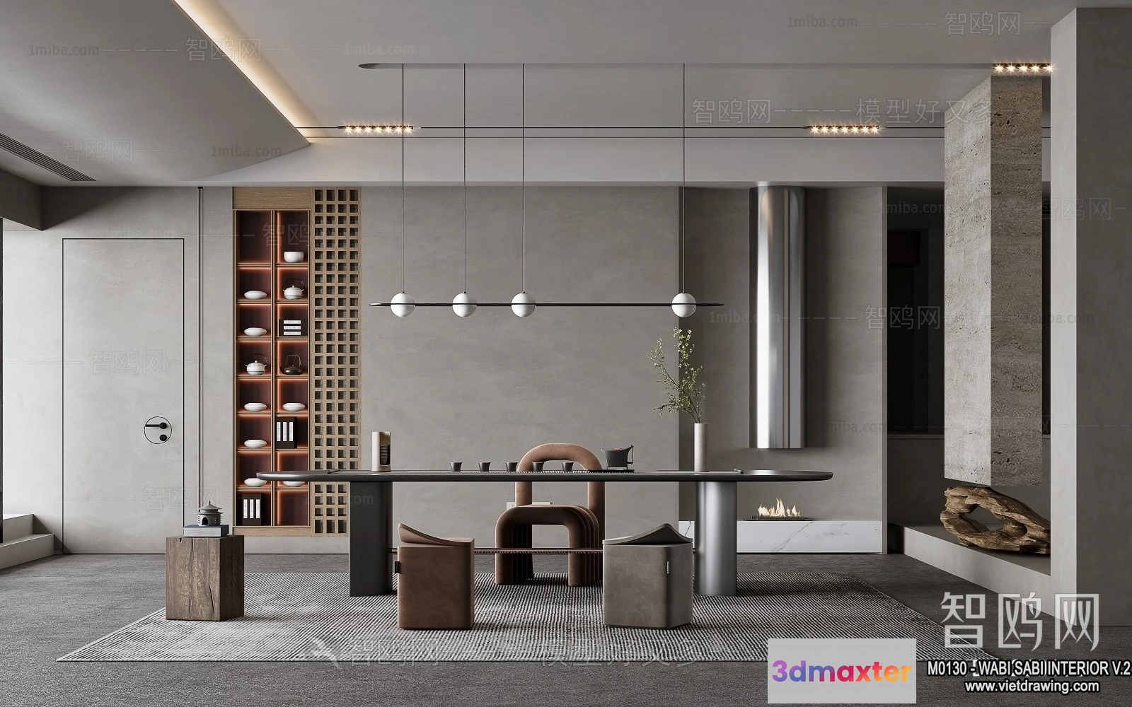 3D Models / 3D Scenes / Interior / Office Home / Tearoom and Study 3D Interior Scene Model – Wabi Sabi Style – 035 3D Max