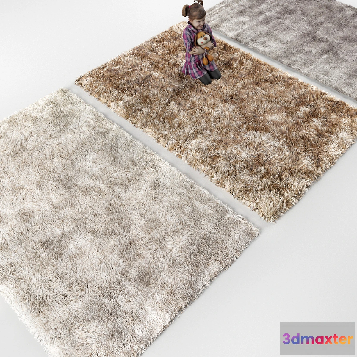 MODEL CHILD inserted for scale in the archives of ITS no. DESCRIPTION: fur fluffy carpets beige and gray colors ATTENTION !!! To correctly display: System Units Setup – Millimeters Rendering> Effects> Hair and Fur> Hair> mr prim only format .MAX 2014 file (in other formats flies setting hair and fur and put them senseless) to accelerate render: reduce parameter Hair count up 150000-40000 For those who use other system units (in these models mm) when working with hair and fur For those who use