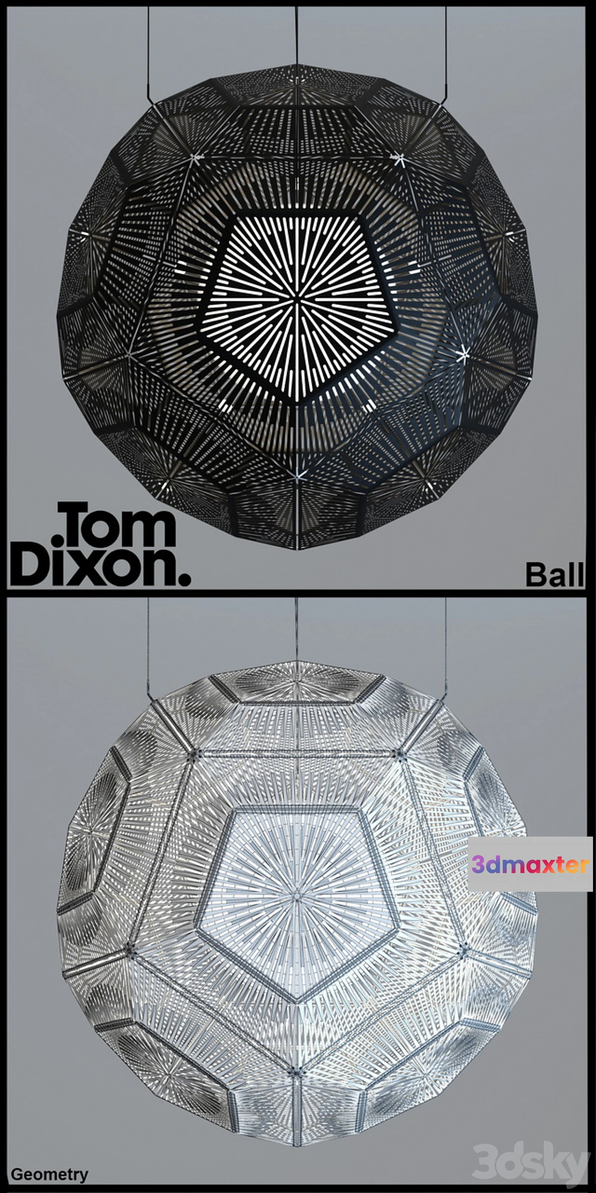 Tom Dixon Ball http://www.tomdixon.net/products/us/ball Dimensions: Diameter – 1.2m in the archive 2 models: ball_geometry – all done geometry polyrate: 102032 ball_opasity – perforation made cards opasity polyrate: 23864 Complete present fbx and obj