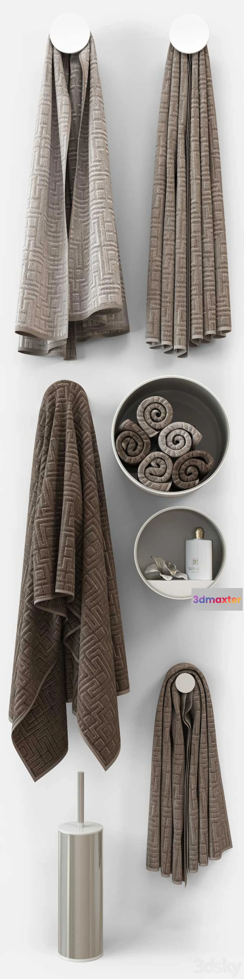 FBX + Polys: 109011 polygonal quads only towels Size: 700mm.x1400mm. 500mm.x900mm. 340mm.x780mm. Color change map tow_color tow_color_01 tow_color_02. Additional smoothing groups. Set for bathroom RIFRA Circle Website: http://www.rifra.com/ru/prodotto/circle-2.aspx