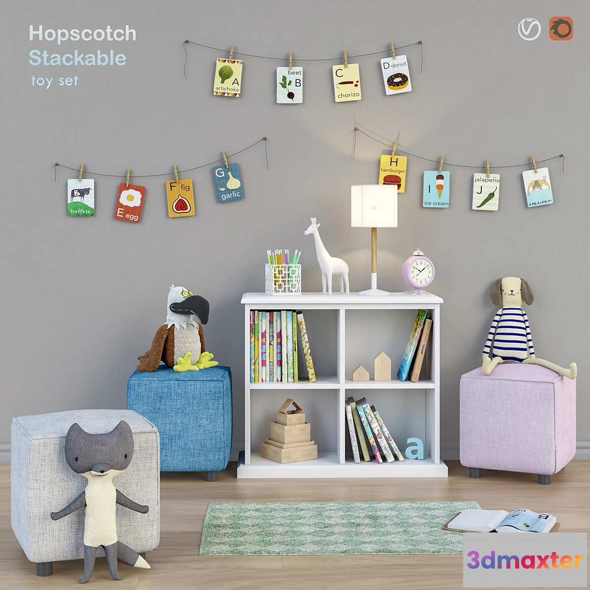 CORONA + VRAY (2013) FBX CORONA + VRAY (2009) Very convenient and practical closet – shelving with open shelves for toys books and accessories for the children’s room from the manufacturer Hopscotch Stackable as well as the set contains soft ottomans – modules Hannah Cube Ottoman toys and decor for the nursery. The kit contains: Hopscotch Stackable cabinet dimensions 780 mm wide height 680 mm depth 300 mm. Soft ottomans – modules Hannah Cube Ottoman (3 color options) dimensions width 355 mm height 355 mm depth 355 mm. Decorative cards – pictures on clothespins (ArtPompadoo).