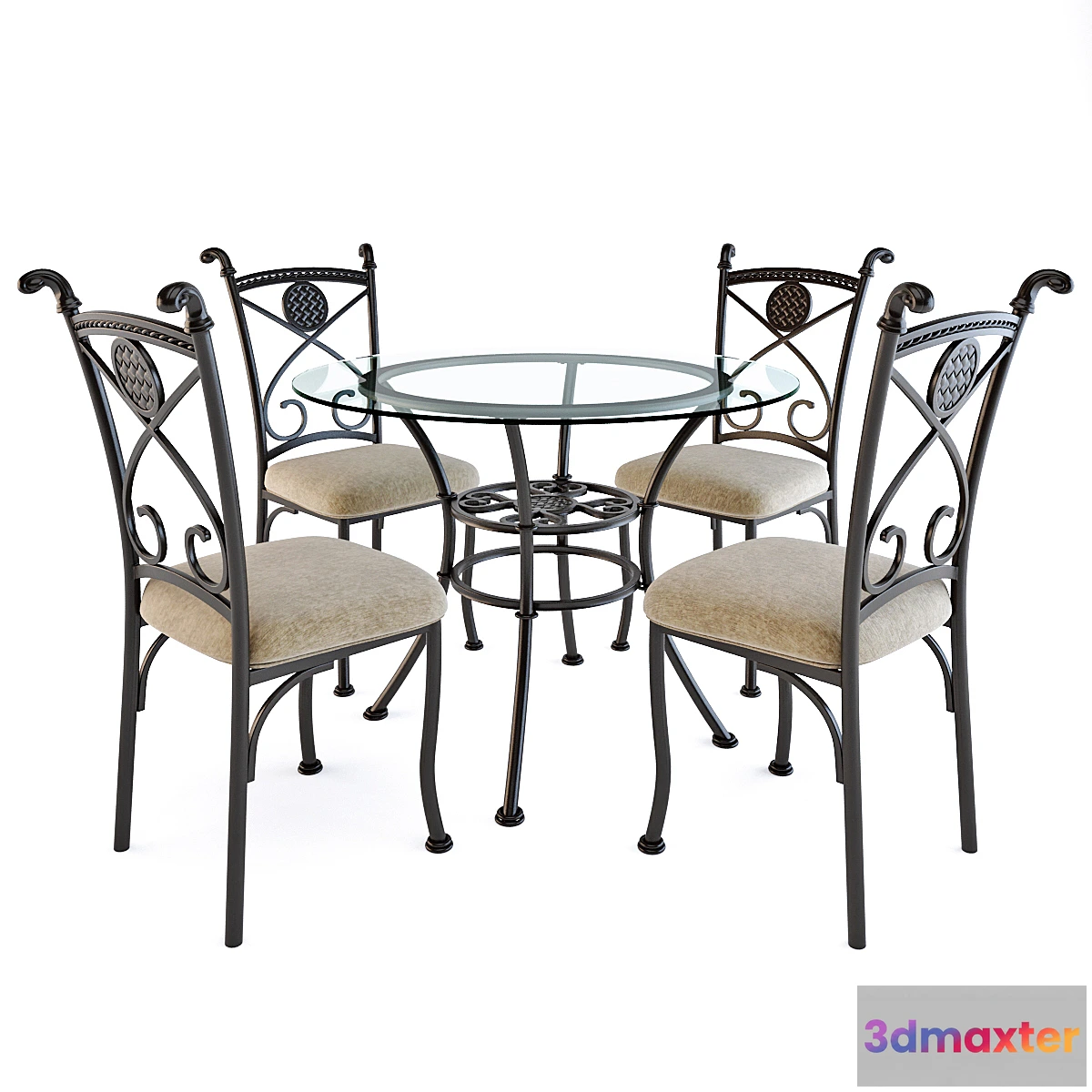 Traditional wrought iron dining table and chairs.Table diameter: 106 cmTable height: 76 cmChair height: 101 cmFormat: .max .fbx .obj