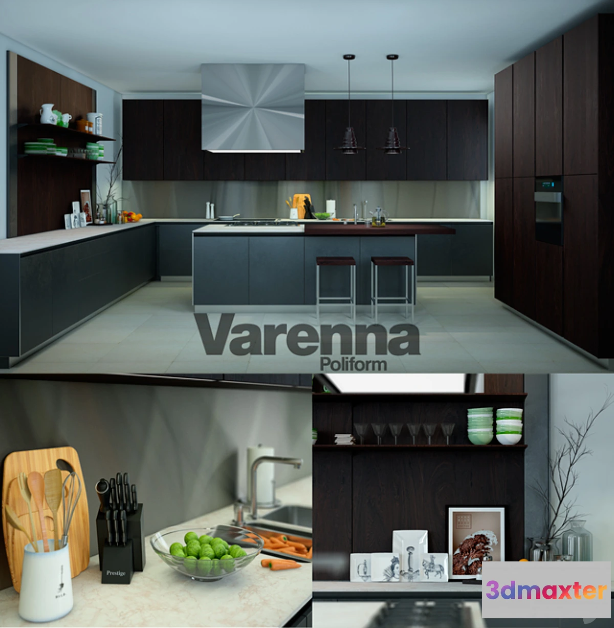 Poliform Varenna Twelve kitchen with decoration Poliform Block chair Foscarini diesel pendant Knight Dinnerware plates by Mitchell Black glass teapot Menu knives Prestige vegetables and fruits.