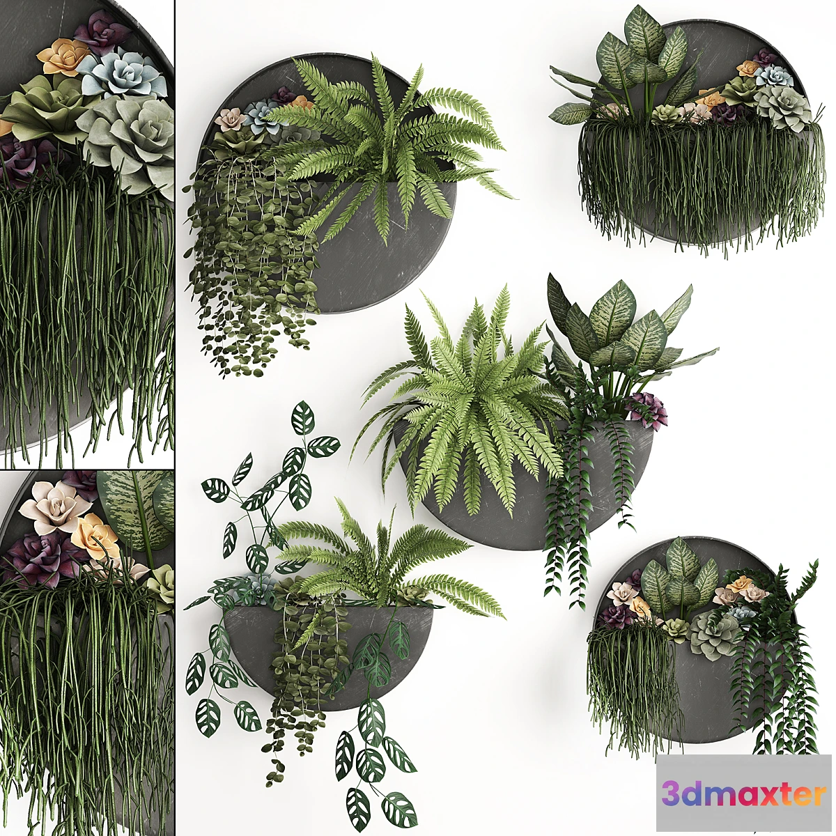 Vertical landscaping for the wall with a black metal shelf with Garden Succulents hanging plants Ferns. Set 56