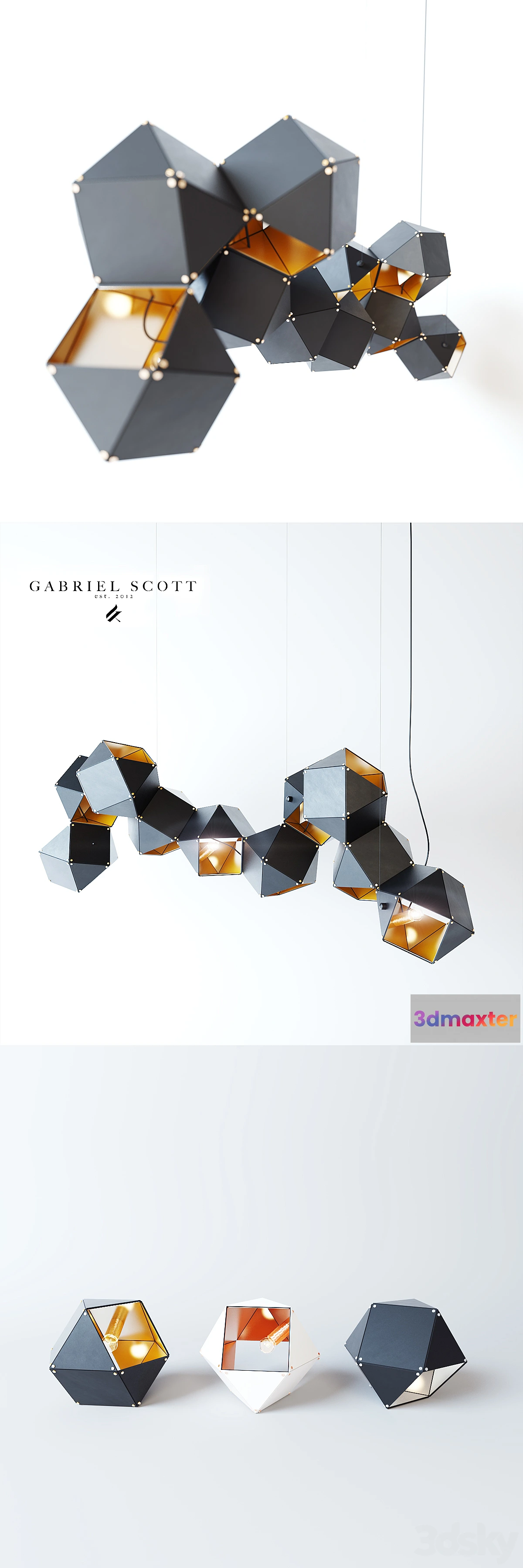 Made up of a series of interconnected geometric metallic shapes The WELLES is a modular and customizable light-system that forms a sculptural and organic shape in all its various configurations and dimensions. From long branches to bouquet structures to single suspended units the nature of this piece allows for infinite silhouette options. Available Finishes: Exterior: Blackened Steel Matte White. Interior: Satin Brass Satin Copper Satin Nickel Light Source: 15 Watt E-12 Incandescent Bulb. Dimensions