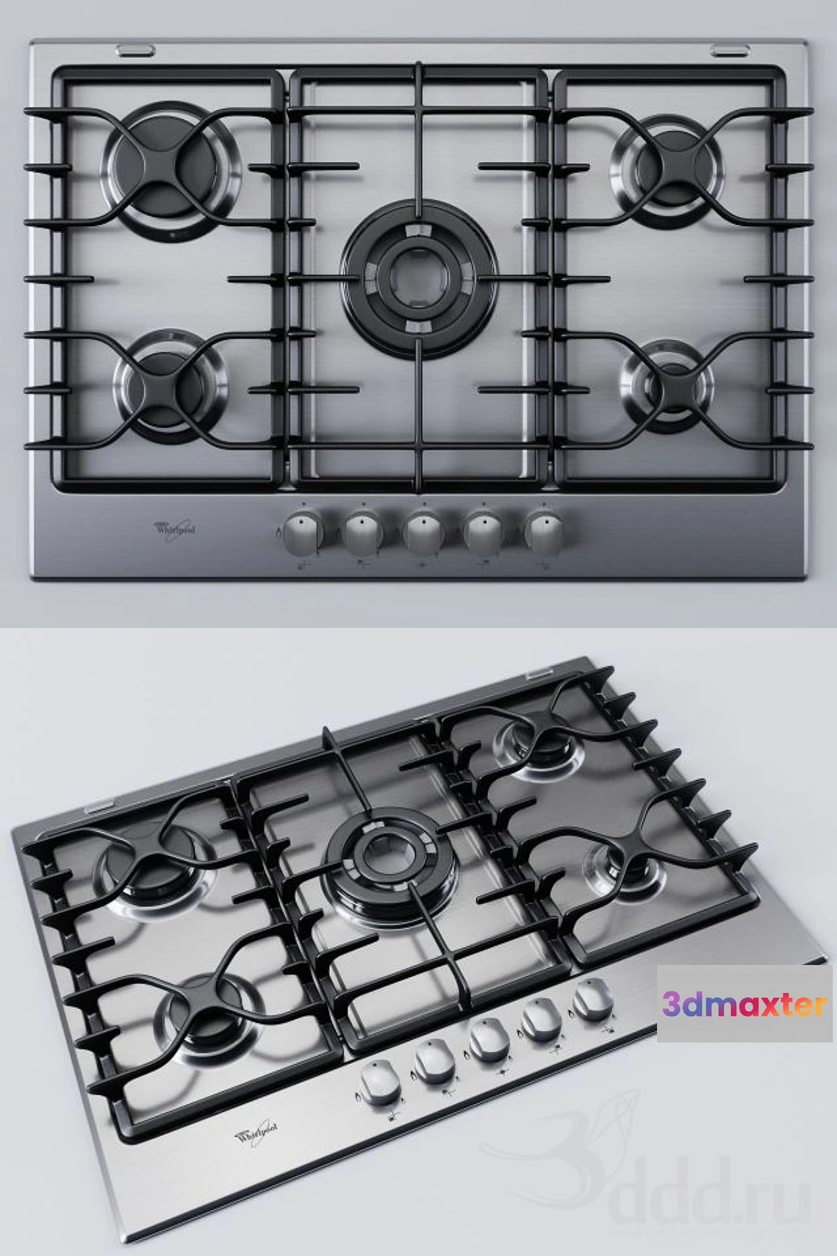 Whirlpool AKT 797 IX Stainless Steel Wok 5 Burner Gas Hob. Modelled in 3ds Max 2011. All quad with turbosmooth applied. V-ray materials with maps. FBX model is base mesh.