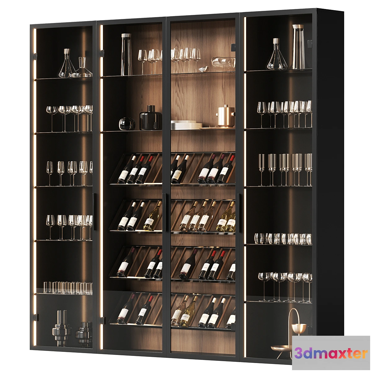 More wine-themed models: https://3dsky.org/collection/shared/5268518 nnThe archive contains a 3ds max 2015 scene for Corona and V-Ray + fbx files.nnPreview renderings were made in Corona Render 9. On the Corona Legacy Mtl. Requires Corona Render version 1.5 or higher. Conversion of materials to V-Ray was done using V-Ray scene converter.nnAll objects except the cabinet and shelves have the Turbosmooth modifier applied during rendering (geometry for anti-aliasing). Adjust the degree of smoothing as needed.nnPoly: 65544nVerts: 67486nnAll my models are optimized made for anti-aliasing (where it is needed). They do not have unnecessary geometry and unreasonably heavy cards. All archives are as light as possible without loss of quality. All objects and materials are named logically.nnFor Corona Render: it is recommended to install version no lower than 1.5 since the glossiness of the materials is adjusted taking into account PBR.nnThose who work in V-Ray versions lower than 3.1 be careful. In the materials in the BRDF section there is Microfaset GTR(GGX) if your version is older than 3.1 then the BRDF field will be empty. Choose Blinn Phong or Ward – whichever is preferable for you.